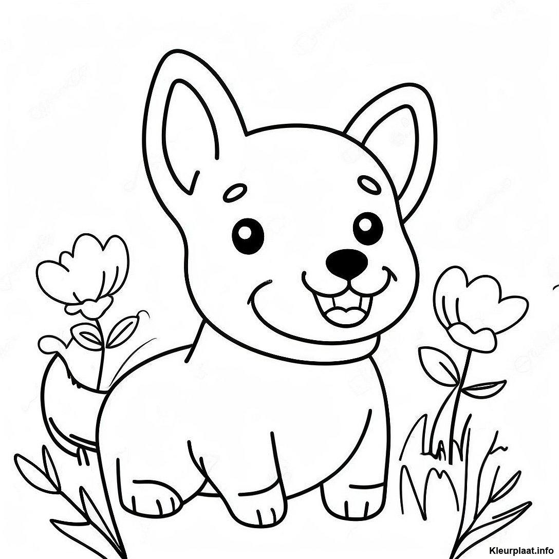 Gelukkige Corgi Met Bloemen Kleurplaat